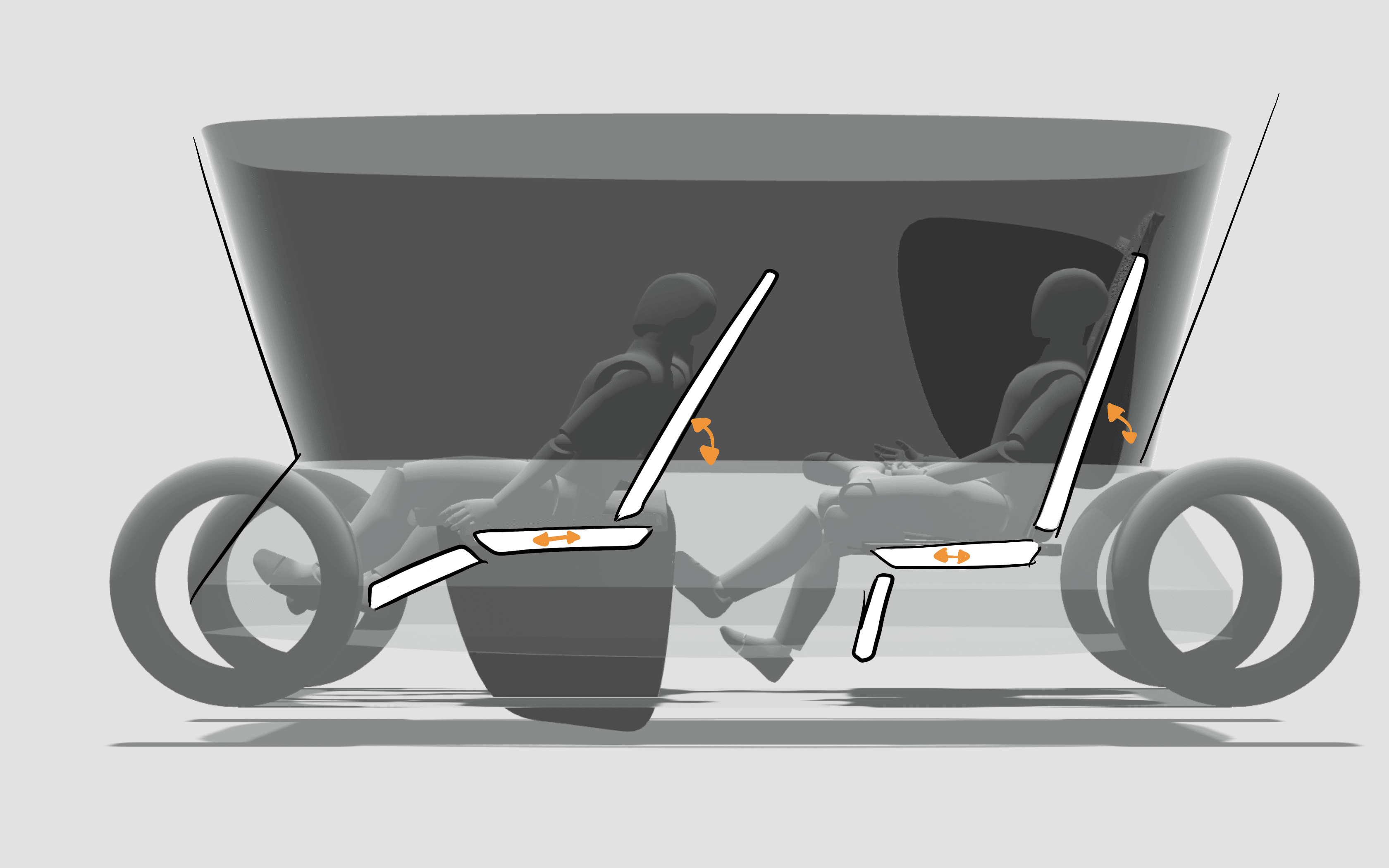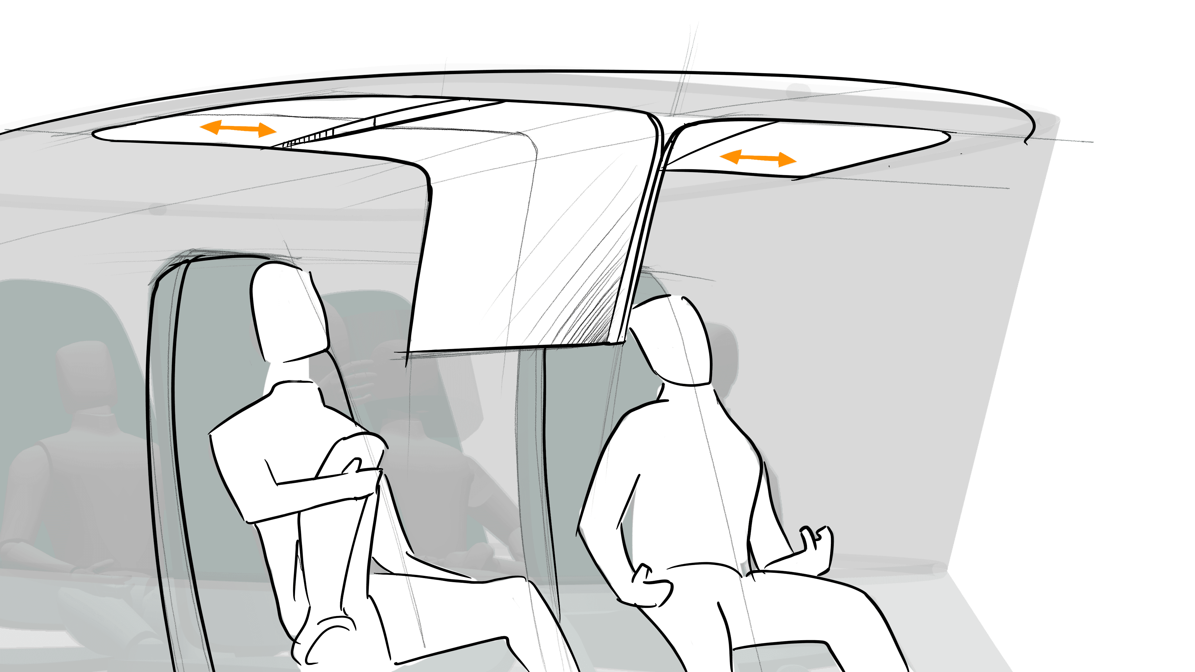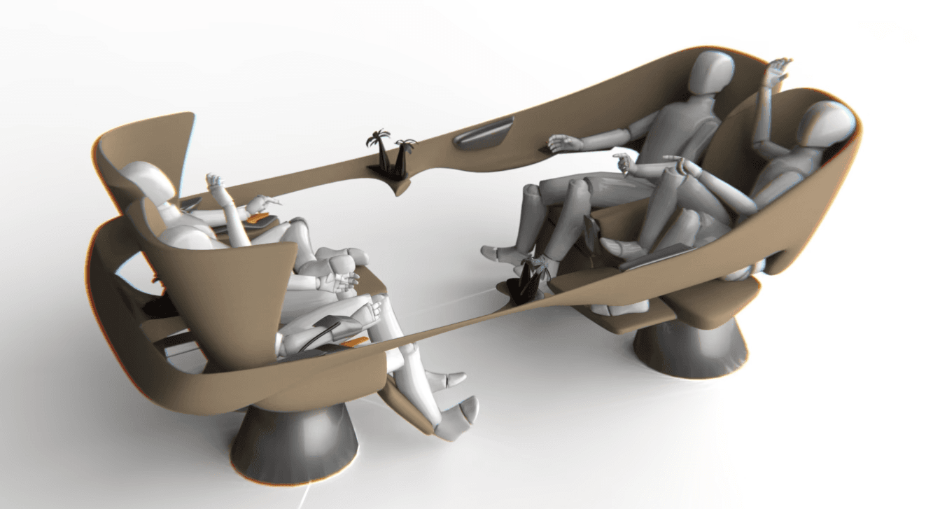 Proposed is an interior for a Level 5 autonomous vehicle with a negative-angle greenhouse and maximized cabin space. The seating layout transforms fluidly across privacy levels randing from solo retreat to shared social setting. Each mode is designed around emotional and sensory comfort, using light, material, and interface transitions to create a sense of calm presence.