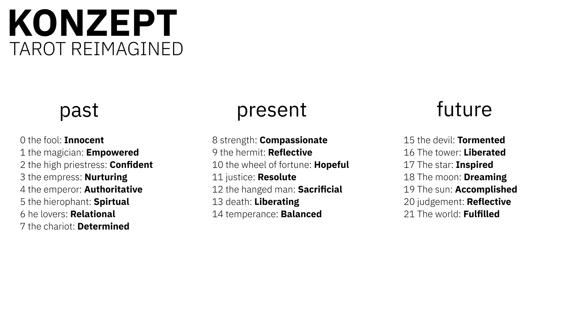 Through discussions and experiments, the project evolved from 8 Ball & Me into Virtual Tarot, shifting focus from randomness to emotional interpretation. The Major Arcana became our database, redefined through adjectives that describe human states of being rather than fate.