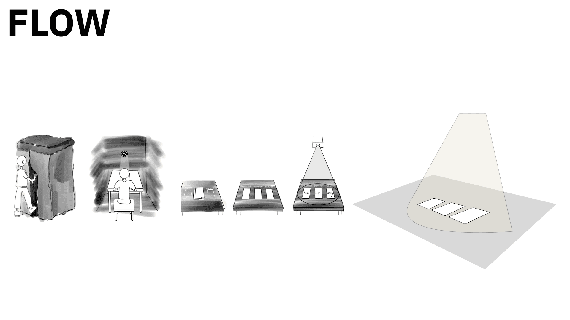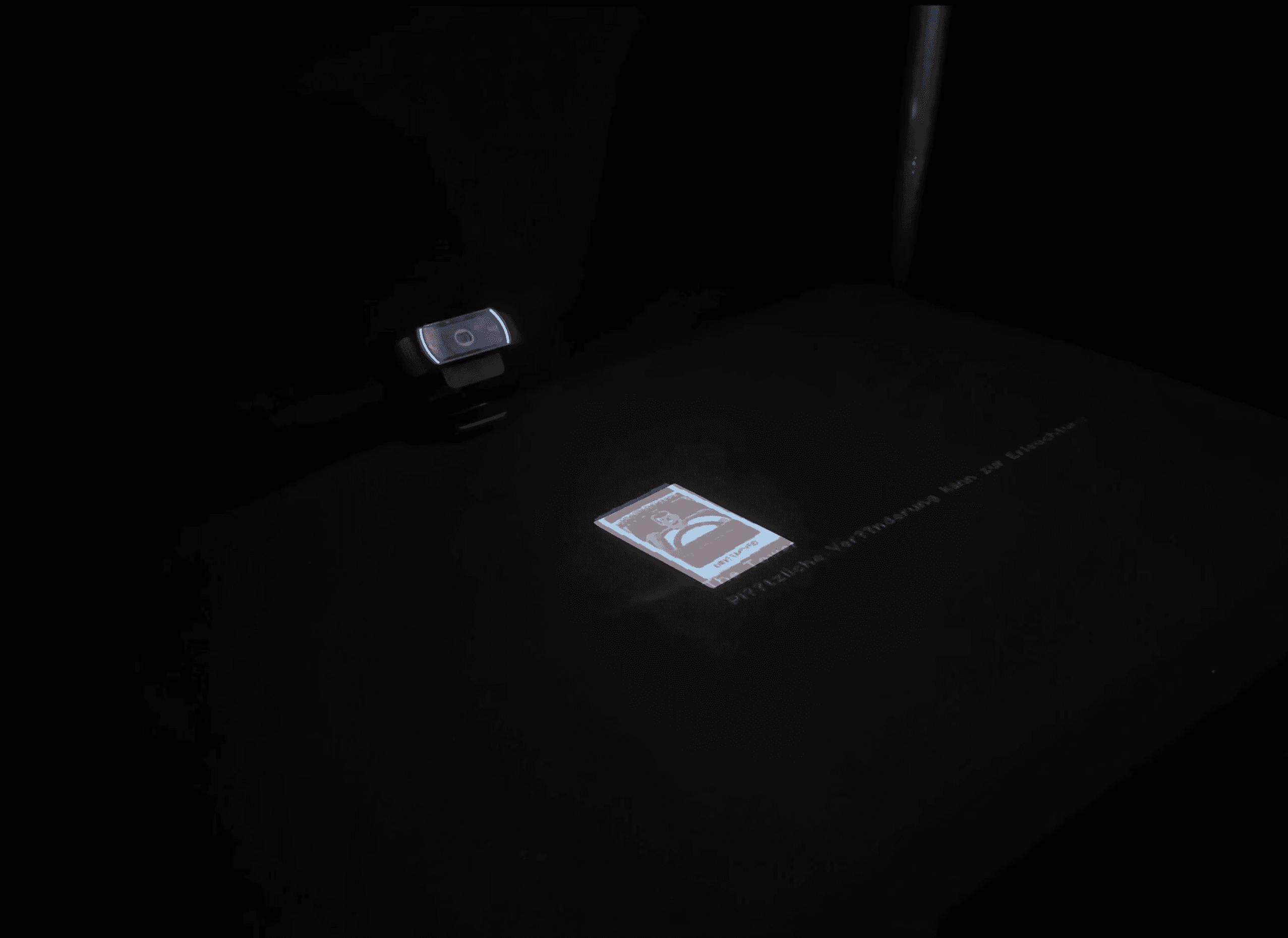 The installation took shape as a small “house of answers”, where a camera scans the visitor’s face and a projection reveals the corresponding cards.For the visual language, we tested different